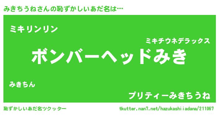 | 意味不明あだ名 | 『住所不定無職みきちうね(6歳)』 |