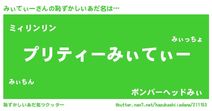 | 男性向けラノベタイトル風あだ名 | 『魔弾の王とみぃてぃー』 |