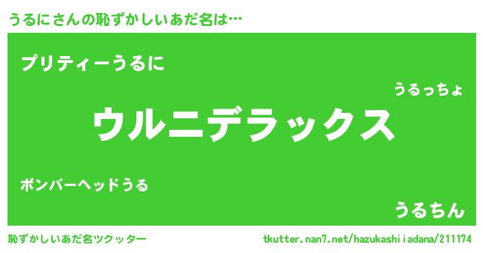 | 男性向けラノベタイトル風あだ名 | 『うるにに滅ぼされるだけの簡単なお仕事です』 |