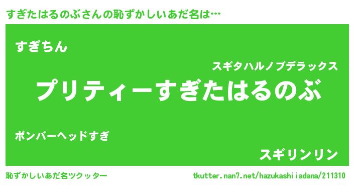 | 男性向けラノベタイトル風あだ名 | 『すぎたはるのぶの憂鬱』 |