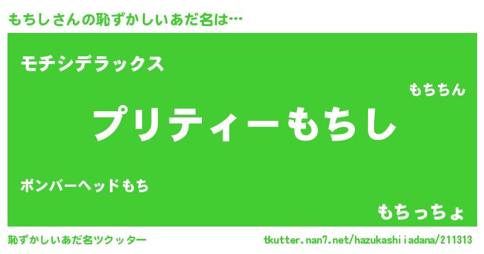 | 男性向けラノベタイトル風あだ名 | 『もちしの憂鬱』『はたらくもちしさま!』 |