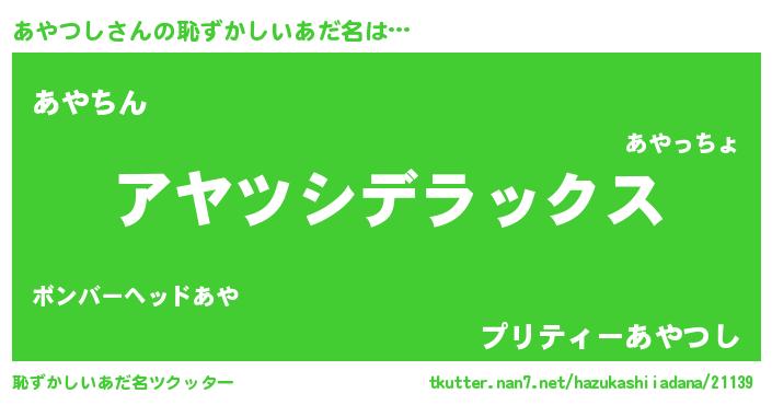 | 男性向けラノベタイトル風あだ名 | 『Re:あやつしから始める異世界生活』 |