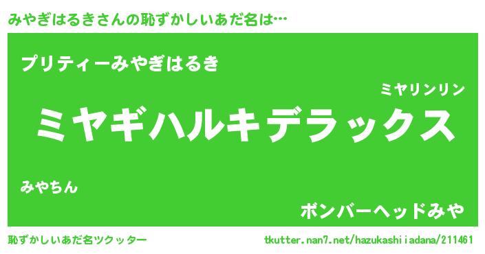 | 男性向けラノベタイトル風あだ名 | 『みやぎはるき~年齢イコール彼女いない歴の魔法使い~』 |