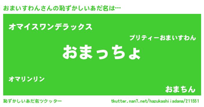 | 女子向けラノベタイトル風あだ名 | 『おまいすわんが死なない童話 林檎のおまいすわんの診療簿』 |