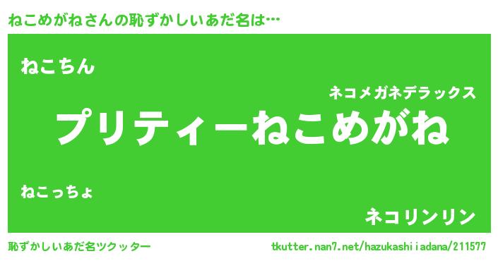 | ヘコむあだ名 | 『ねこもー』『ねこめがね(遠い目)』 |