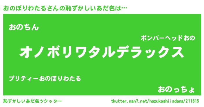 | 男性向けラノベタイトル風あだ名 | 『Re:おのぼりわたるから始める異世界生活』 |