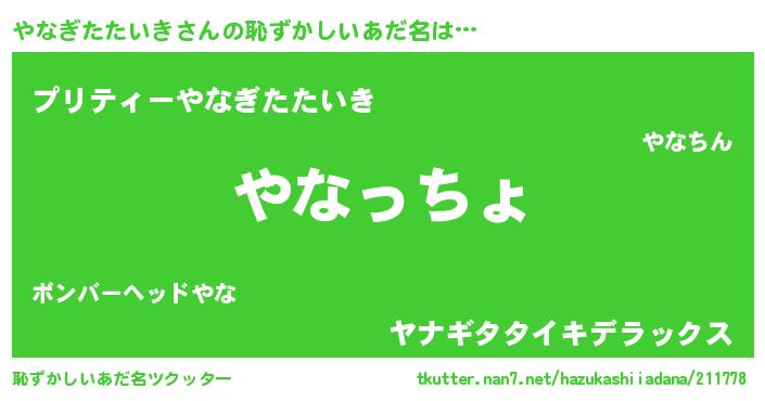 | 男性向けラノベタイトル風あだ名 | 『転生したらやなぎたたいきだった件』 |