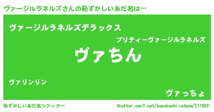 ヴァージルラネルズさんの恥ずかしいあだ名は… 『ヴァちん』『ヴァージルラネルズデラックス』『ヴァっちょ』 ツクッター #恥ずかしいあだ名ツクッター http://tkutter.nan7.net/hazukashiiadana/211899/
