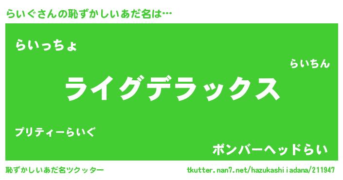 | ヘコむあだ名 | 『豆乳』『らいぐ(震え声)』 |