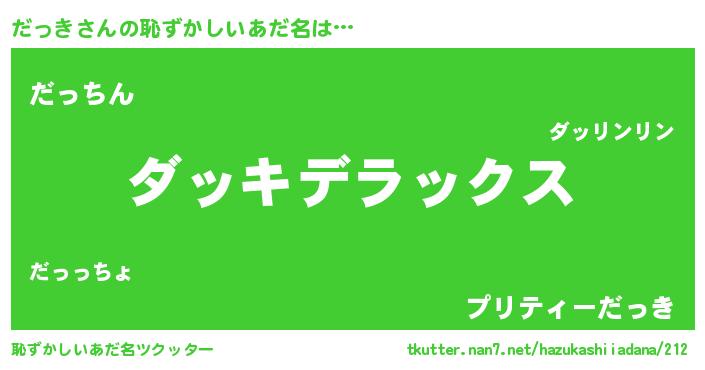 | 男性向けラノベタイトル風あだ名 | 『Re:だっきから始める異世界生活』 |