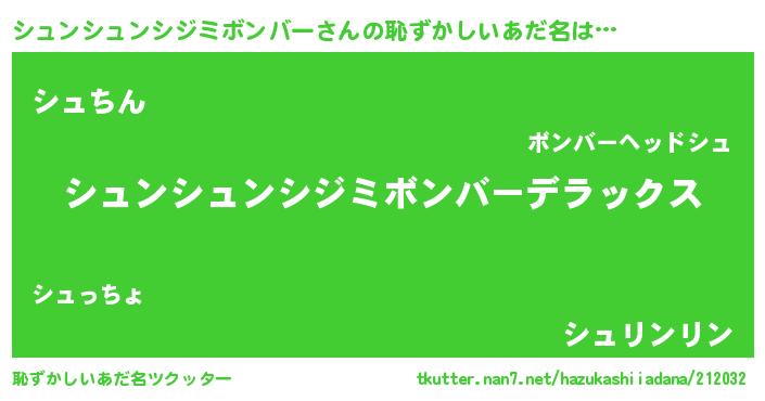 | 男性向けラノベタイトル風あだ名 | 『Re:シュンシュンシジミボンバーから始める異世界生活』 |