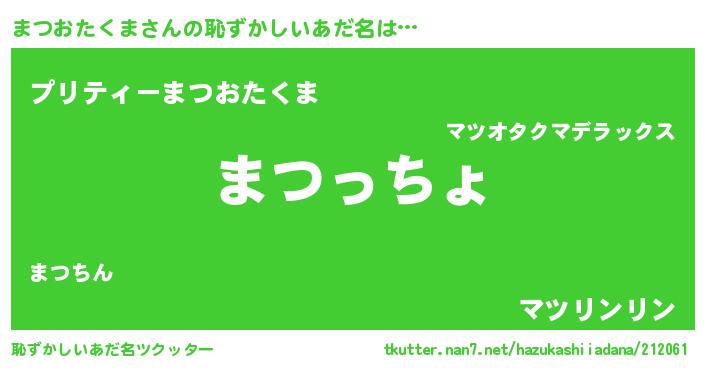 | 男性向けラノベタイトル風あだ名 | 『まつおたくま~年齢イコール彼女いない歴の魔法使い~』 |