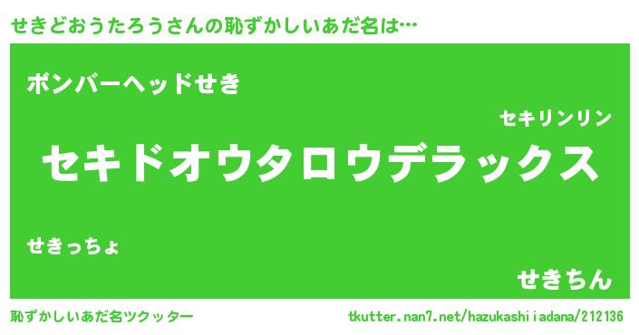 | ヘコむあだ名 | 『せきどおうたろう(苦笑)』『せきを』 |