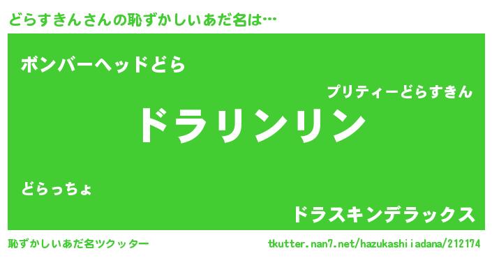 | 意味不明あだ名 | 『住所不定無職どらすきん(91歳)』 |
