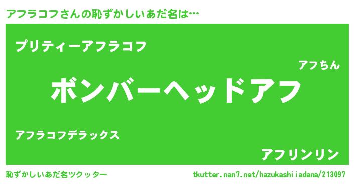 | 男性向けラノベタイトル風あだ名 | 『この素晴らしい世界にアフラコフを!』 |
