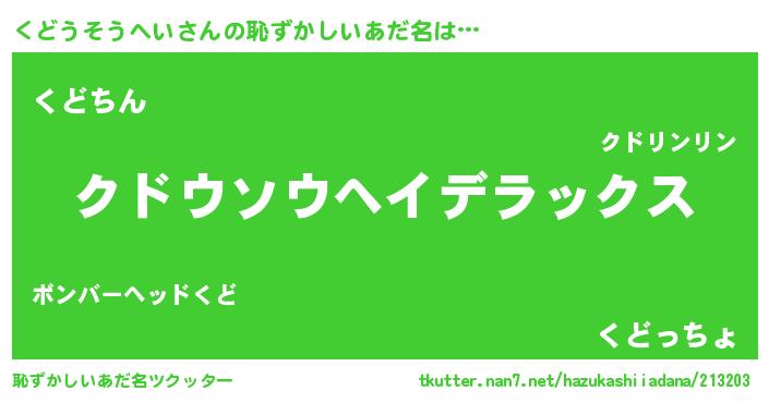 | 男性向けラノベタイトル風あだ名 | 『Re:くどうそうへいから始める異世界生活』 |