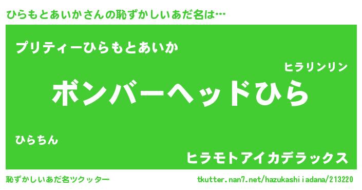 | 男性向けラノベタイトル風あだ名 | 『おまえをオタクにしてやるから、俺をひらもとあいかにしてくれ! 』 |