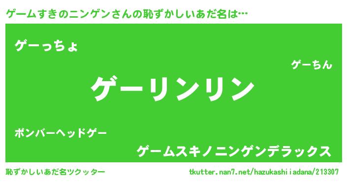 | 男性向けラノベタイトル風あだ名 | 『ゲームすきのニンゲンの嫁は女の子じゃないと思った?』 |