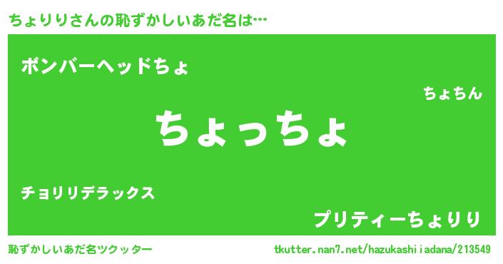 | 男性向けラノベタイトル風あだ名 | 『ちょりりに滅ぼされるだけの簡単なお仕事です』 |
