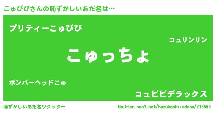 こゅびびさんの恥ずかしいあだ名は… 『こゅっちょ』『プリティーこゅびび』『コュビビデラックス』 ツクッター #恥ずかしいあだ名ツクッター http://tkutter.nan7.net/hazukashiiadana/213560/