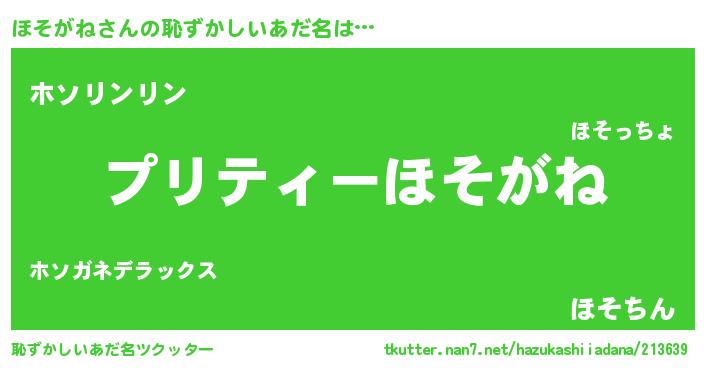 | 胡散臭い通販商品みたいなあだ名 | 『億万長者になれるブレスレット…その名も「ほそがね」』 |