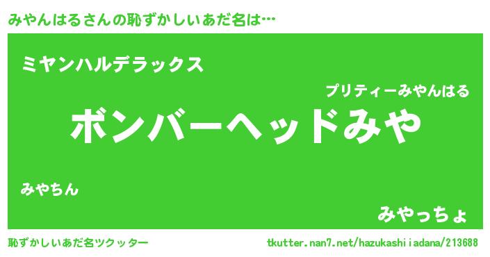 | 女子向けラノベタイトル風あだ名 | 『みやんはる恋絵巻』『闇のみやんはる』 |