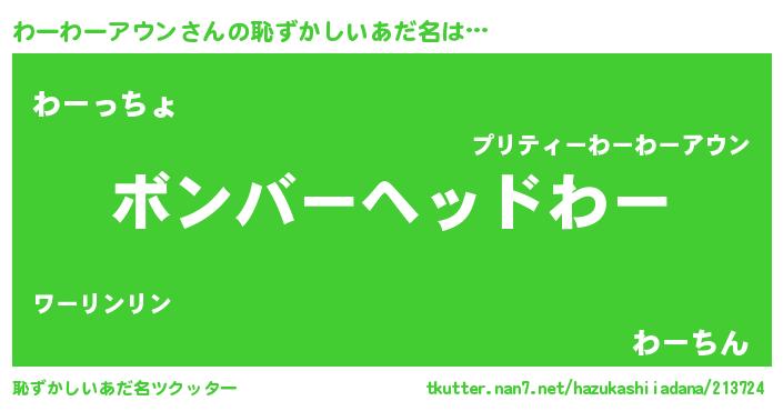 | 男性向けラノベタイトル風あだ名 | 『おまえをオタクにしてやるから、俺をわーわーアウンにしてくれ! 』 |