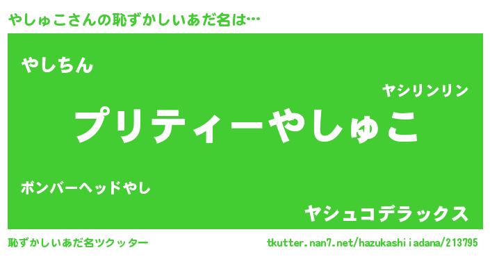 | 意味不明あだ名 | 『ペロリンやしゅこ』『永久保存やしゅこ』 |