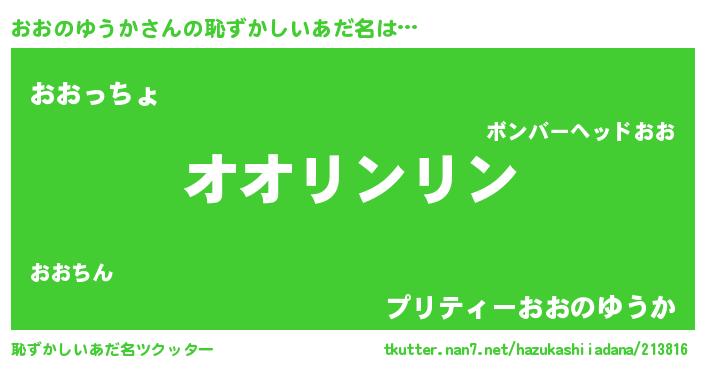 | 男性向けラノベタイトル風あだ名 | 『おおのゆうかの嫁は女の子じゃないと思った?』 |