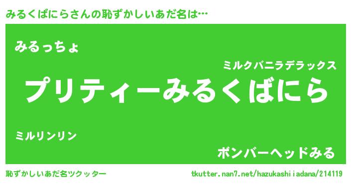 | 男性向けラノベタイトル風あだ名 | 『転生したらみるくばにらだった件』 |