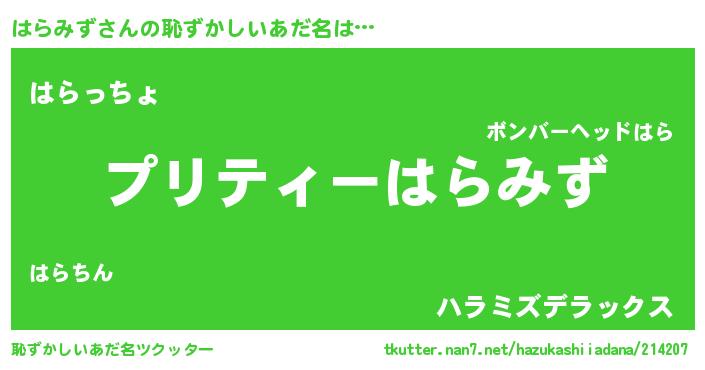 | 男性向けラノベタイトル風あだ名 | 『転生したらはらみずだった件』 |