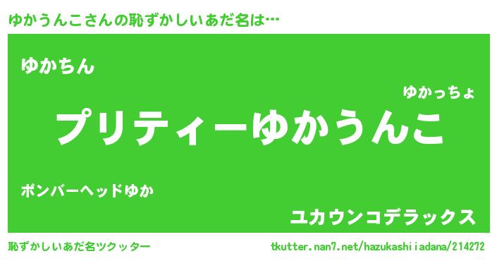 | 男性向けラノベタイトル風あだ名 | 『ゆかうんこ~年齢イコール彼女いない歴の魔法使い~』 |
