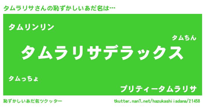| 男性向けラノベタイトル風あだ名 | 『Re:タムラリサから始める異世界生活』 |