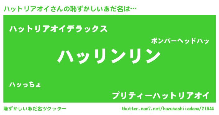 | 男性向けラノベタイトル風あだ名 | 『ハットリアオイの嫁は女の子じゃないと思った?』 |
