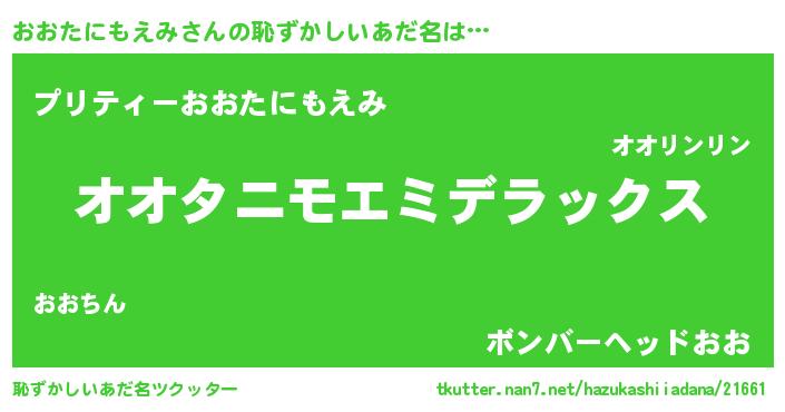 おおたにもえみさんの恥ずかしいあだ名は… 『オオタニモエミデラックス』『プリティーおおたにもえみ』『ボンバーヘッドおお』 ツクッター #恥ずかしいあだ名ツクッター http://tkutter.nan7.net/hazukashiiadana/21661/