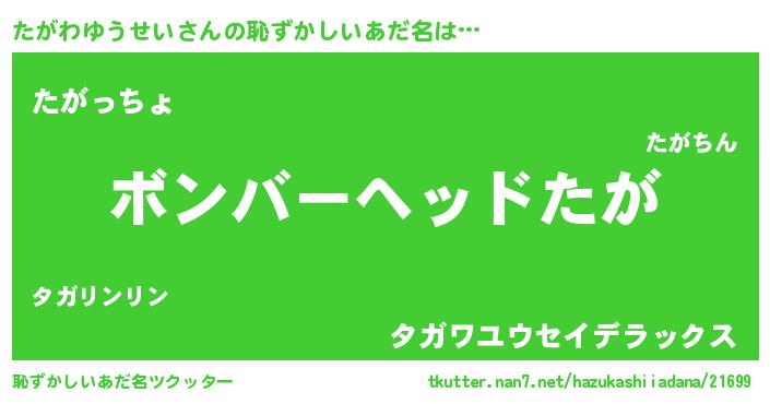 | ヘコむあだ名 | 『豆乳』『たがわゆうせい(苦笑)』 |