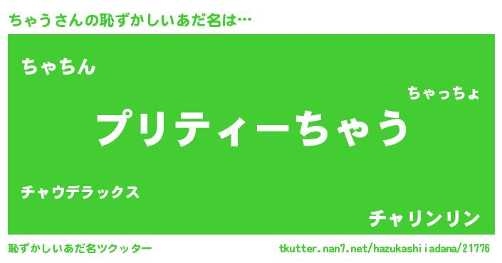 | 男性向けラノベタイトル風あだ名 | 『この素晴らしい世界にちゃうを!』 |