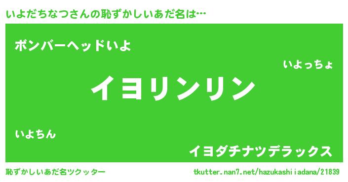 いよだちなつさんの恥ずかしいあだ名は… 『イヨリンリン』『ボンバーヘッドいよ』『イヨダチナツデラックス』 ツクッター #恥ずかしいあだ名ツクッター http://tkutter.nan7.net/hazukashiiadana/21839/