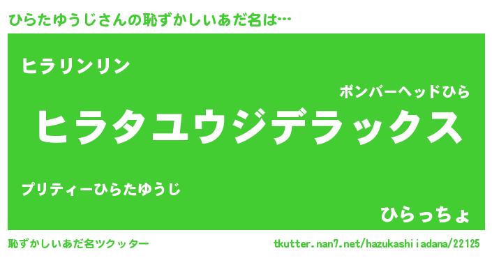 ひらたゆうじさんの恥ずかしいあだ名は… 『ヒラタユウジデラックス』『ヒラリンリン』『ひらっちょ』 ツクッター #恥ずかしいあだ名ツクッター http://tkutter.nan7.net/hazukashiiadana/22125/