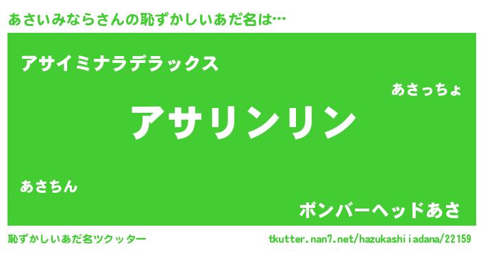 | 男性向けラノベタイトル風あだ名 | 『あさいみならに滅ぼされるだけの簡単なお仕事です』 |