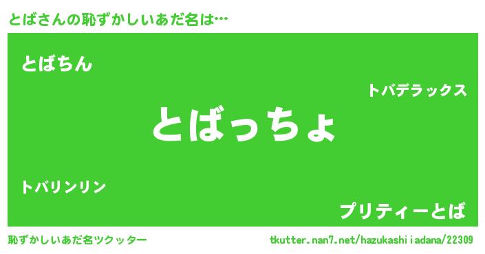 | 男性向けラノベタイトル風あだ名 | 『緋弾のトバ』『トバスレイヤー』 |