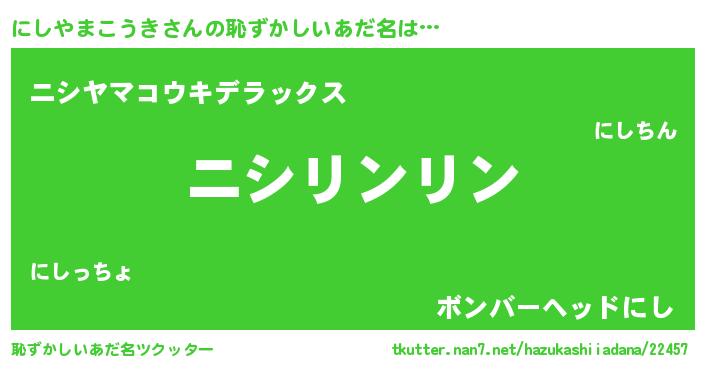 | ヘコむあだ名 | 『にしぷりん』『にしやまこうき(遠い目)』 |