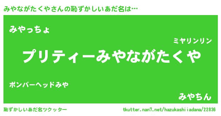 | 意味不明あだ名 | 『住所不定無職みやながたくや(47歳)』 |