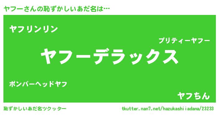 | 女子向けラノベタイトル風あだ名 | 『闇のヤフー』『ヤフーの玉の輿計画!』 |