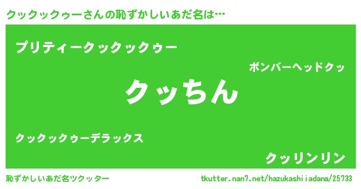 | 男性向けラノベタイトル風あだ名 | 『クックックゥーという概念が存在しない退屈な世界 』 |