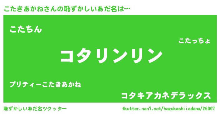 | 男性向けラノベタイトル風あだ名 | 『こたきあかねの嫁は女の子じゃないと思った?』 |