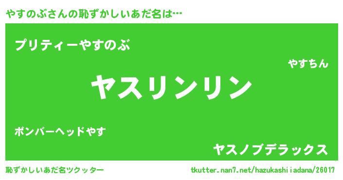 | 男性向けラノベタイトル風あだ名 | 『やすのぶの嫁は女の子じゃないと思った?』 |