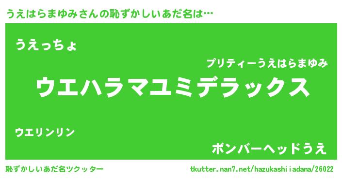 | 男性向けラノベタイトル風あだ名 | 『魔弾の王とうえはらまゆみ』 |