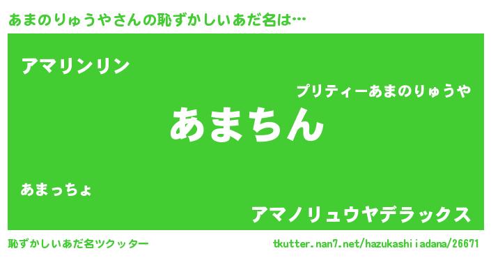 | 男性向けラノベタイトル風あだ名 | 『あまのりゅうやに滅ぼされるだけの簡単なお仕事です』 |