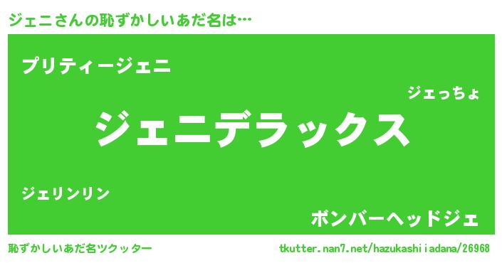 | 男性向けラノベタイトル風あだ名 | 『ジェニスレイヤー』『ジェニの憂鬱』 |